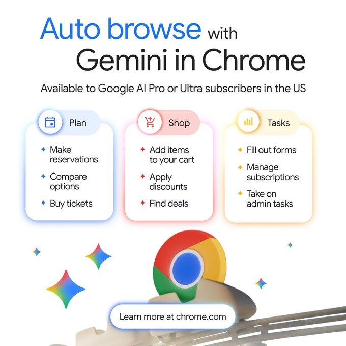 Gemini 3 Auto Browse lets Chrome navigate websites and complete multi-step tasks for you. Assign it a job, a new tab opens with a side panel tracking every step as the AI clicks, scrolls, and fills out forms. It can research travel across multiple dates, manage subscriptions, even handle tax documents. Rolling out now to AI Pro and Ultra subscribers in the US.