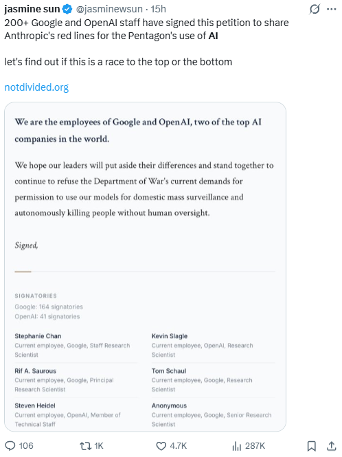 Yep. Over 100 DeepMind employees signed a letter demanding ethical boundaries on military work. No Gemini in mass surveillance. No autonomous weapons without human oversight. Some said they'd walk if leadership doesn't commit.